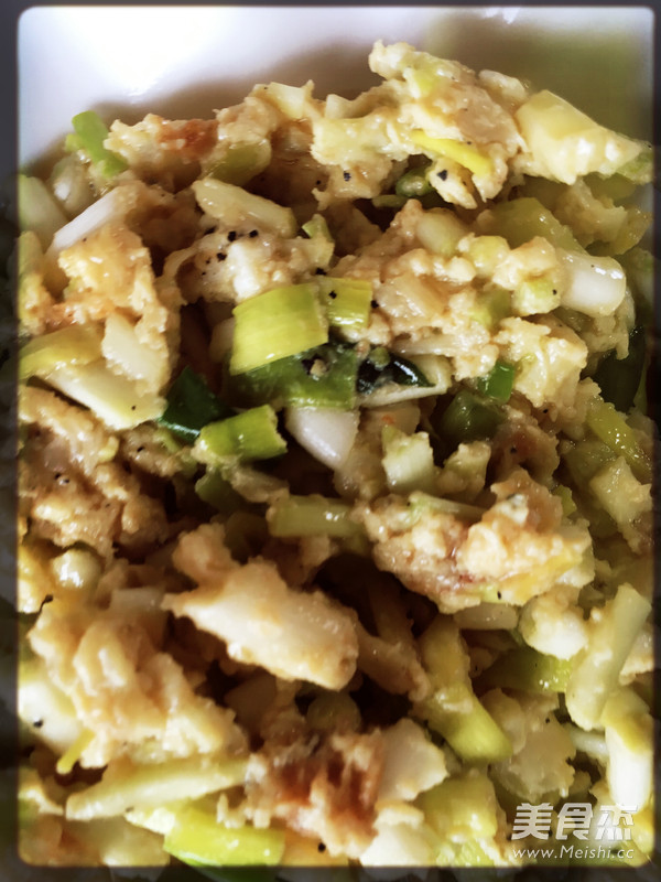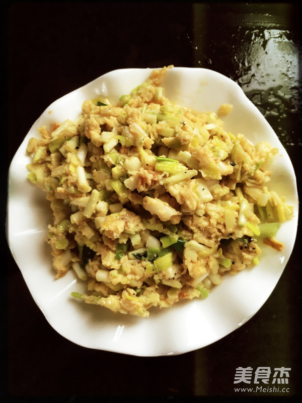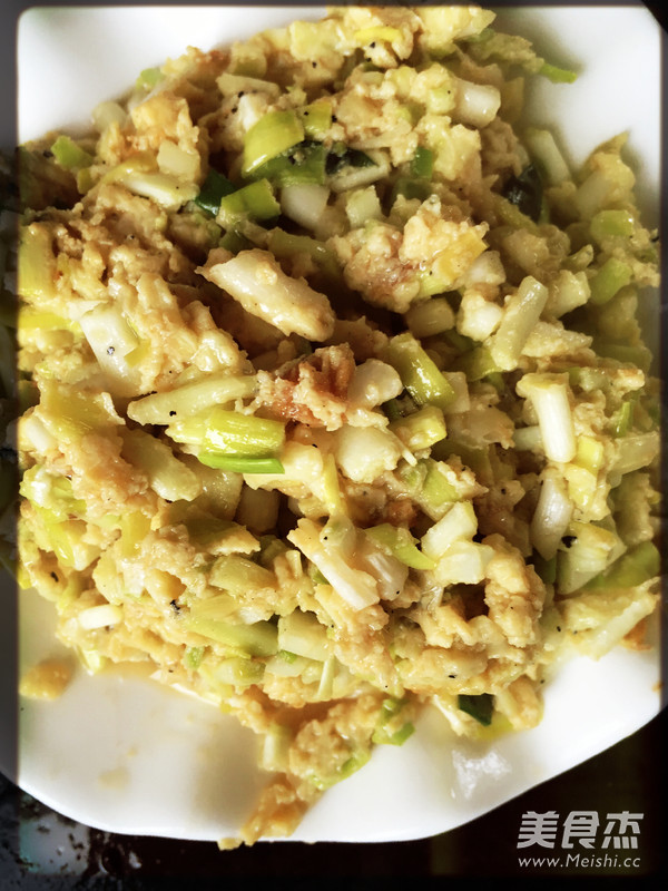 3.锅烧热加入油,将韭黄蛋加入煎至一面好了之后翻另一面然后划散,加入盐和蚝油翻炒均匀即可