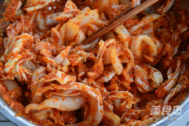 9.将酱汁拌入之前切得大条的白菜叶,搅拌均匀即可。