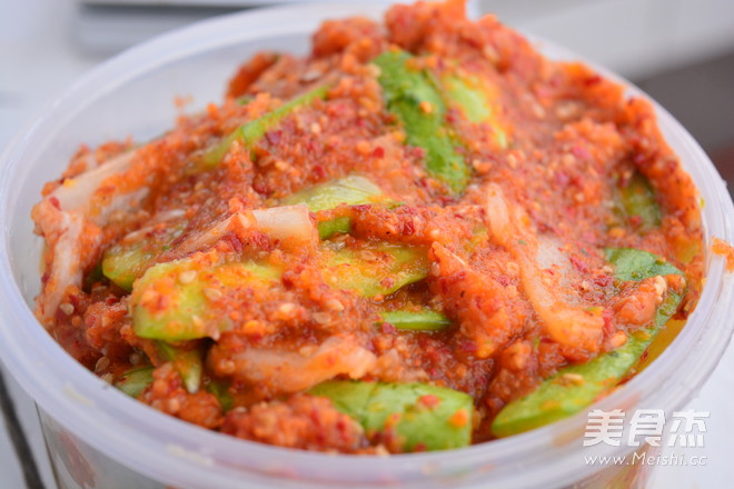 6.将黄瓜条用流水冲净表面的盐分,拧干水分。拌入之前做好的辣椒酱。腌制一夜。就可以食用了。