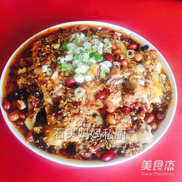 7.焙干的辣椒花椒捣碎,用热油泼好,和调好的汁一起搅拌放芝麻。