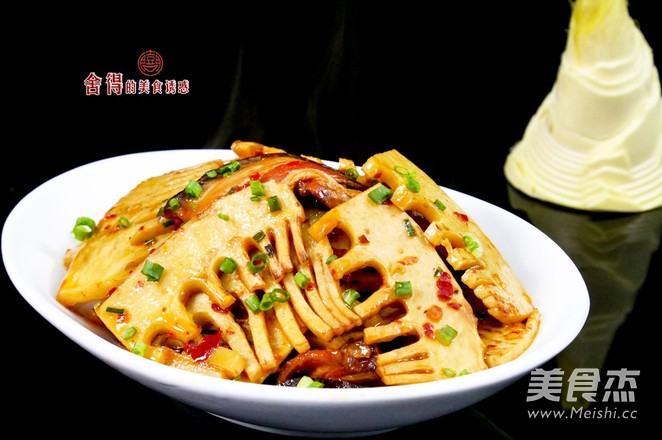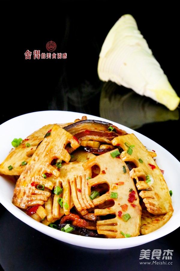 5.倒入冬笋,加适量的水,盖上锅盖,大火焖2分钟,水份快干时,开盖,加适量鸡精和辣椒粉翻炒,汤汁快干时,淋入少量生粉水,炒均,撒上葱花即可起锅。