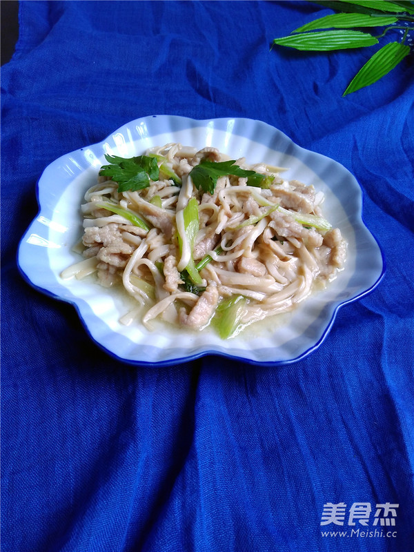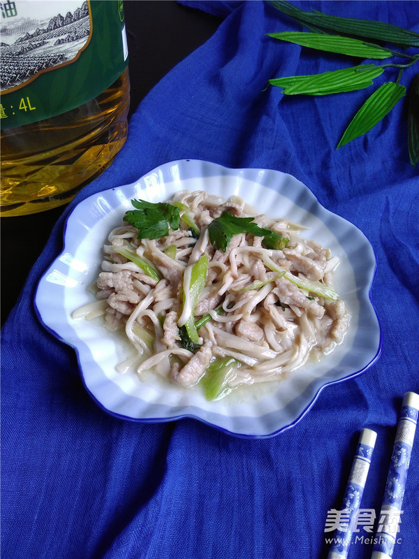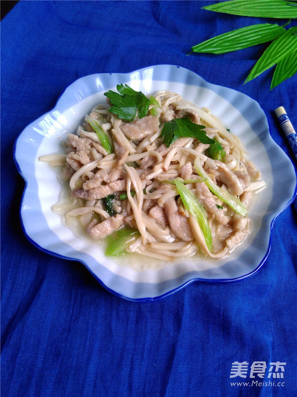2.猪瘦肉洗净,切成肉丝;杏鲍菇洗净切丝,芹菜洗净斜切成小段。