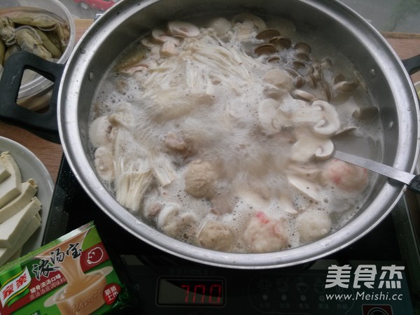 7.然后把三种菌菇都放进去,再次等水开,汤底就完成了。接下去,就按各人喜欢,大块朵颐吧