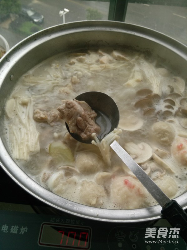排骨600克 平菇100克 金针菇100克 蘑菇100克 贡丸100克
