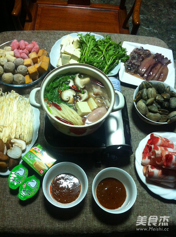 豆腐200克 茼蒿200克 各种丸子500克 金针菇200克 香菇200克 干辣椒6个 枸杞5克 大葱5克