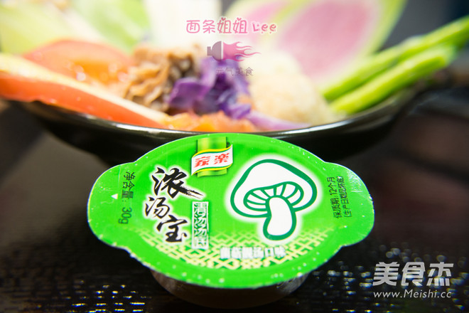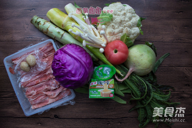 1.各式新鲜食材准备妥当。这里有精选肥牛片、紫甘蓝、上海本地芸豆、香莴笋、海鲜菇、茭白、花菜、蕃茄和心里美。当然还有能瞬间变化出鲜美火锅高汤的主角,家乐浓汤宝(菌菇味)