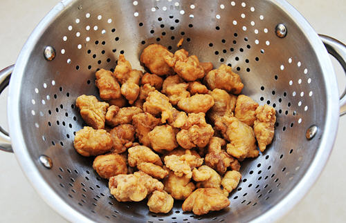 5、油温170度下入鸡块,变色后捞出,然后再复炸一次至金黄色。(第一次炸熟,第二次上色,如果想吃很脆的口感,就大火炸)
