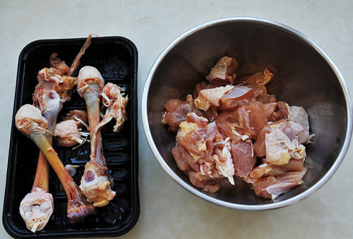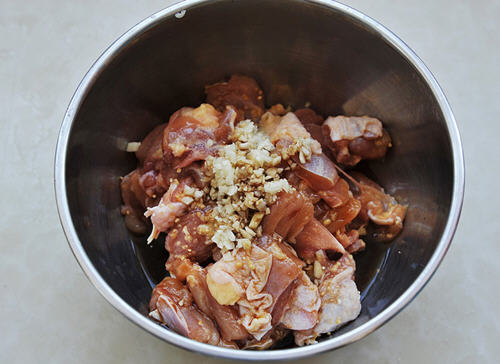 2、鸡腿肉切成2、3厘米的块状,如果想吃“鸡米花”状就切小一些。