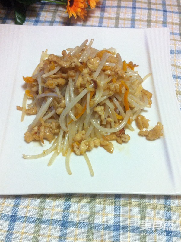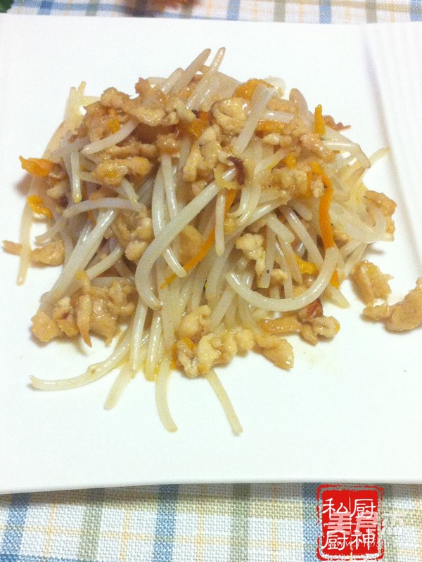 6.煸炒片刻放绿豆菜加盐水淀粉勾芡淋香油翻勺即可。