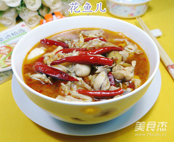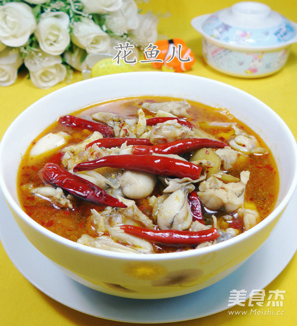 12.然后,下入炒好的牛蛙翻动一下煮开至熟。