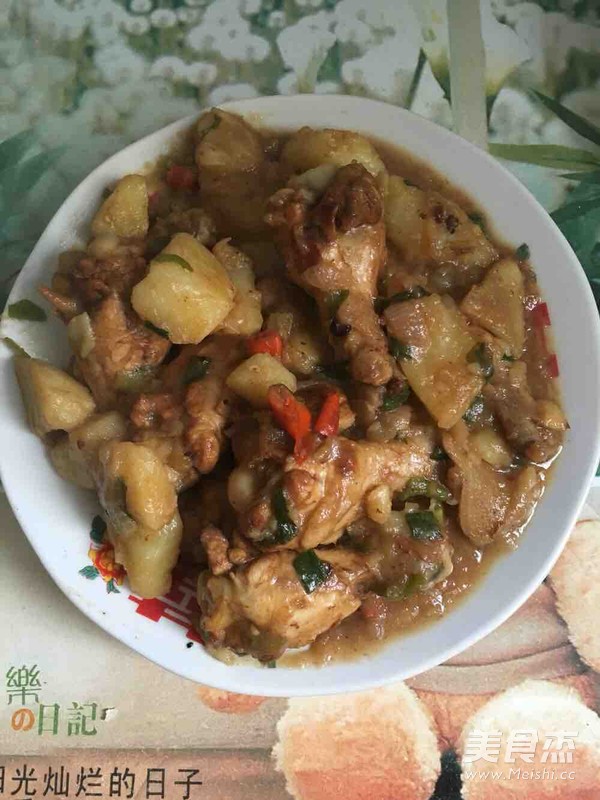 7.等土豆均匀上色,放入盐,翻炒,然后加水没过鸡腿,撒上葱花大火炖七八分钟。