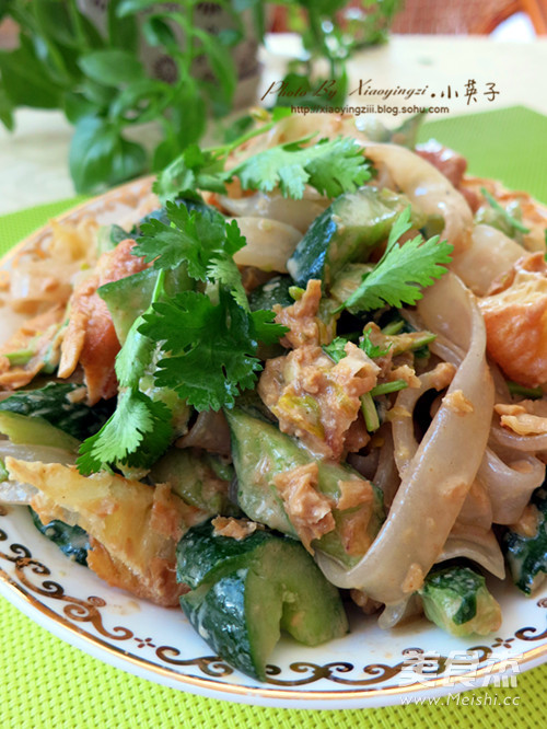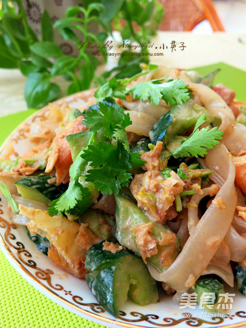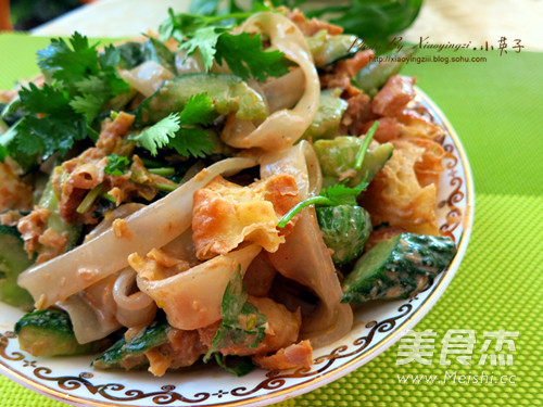 1.材料:黄瓜一根、剩油条两根、宽粉适量、芝麻酱适量、芝麻油适量、盐2克、蒜泥适量 鲜味酱油10克 香醋20克 凉开水适量