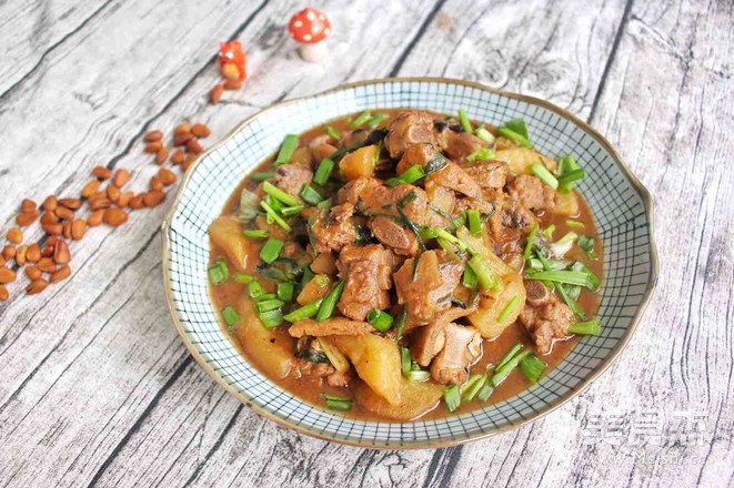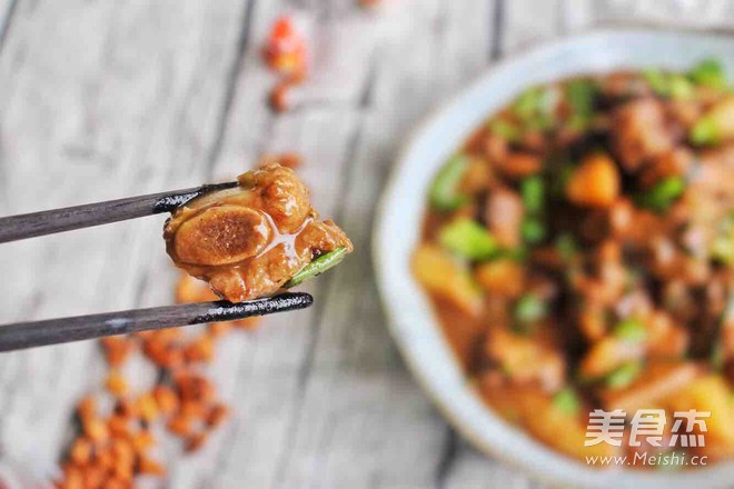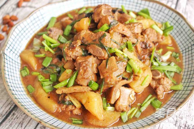 5.加入土豆翻炒,干锅时酒入料酒翻炒,加入酱油翻炒