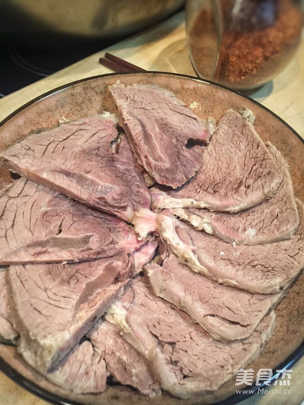 5.煮成后不要掀开锅盖,将整锅肉浸泡在卤中自然冷却,卤制至少3小时,也可放冰箱卤制过夜。食用时,捞起牛肉,自然风干后切片装盘。