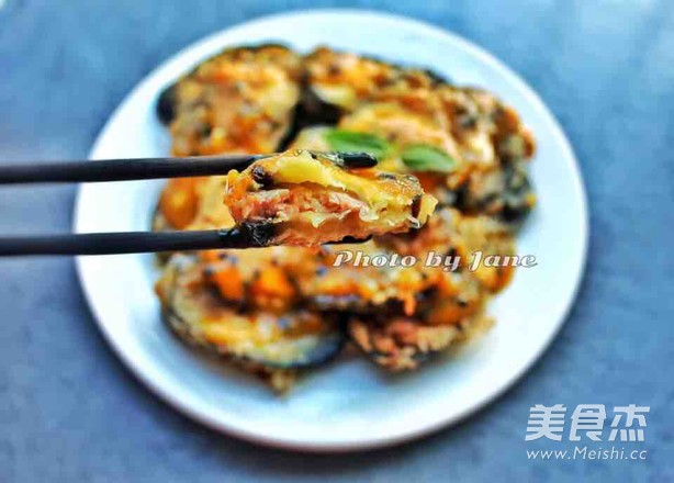 5.做好的茄盒两面沾上蛋液,然后再裹上生粉或面包糠,然后下锅中火煎至两面金黄色,加一点水,盖盖,将肉焖熟,再煎干水即可。也可以将其炸熟