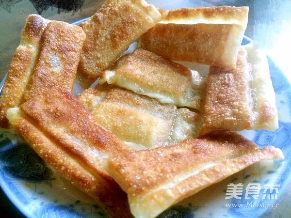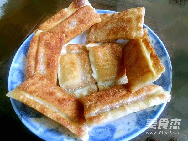 2.将混沌皮四周涂上蛋液,将长条形年糕包好。这是普通的脆皮年糕