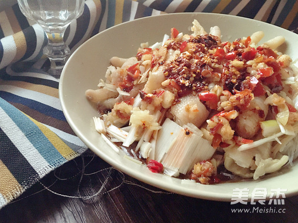 8.把料汁浇在鸡爪子上,然后锅中烧少许热油,放入一勺剁椒,剩下一半的蒜蓉,爆香,然后一起浇在上面,最后淋些香油花椒油什么的提味即可。