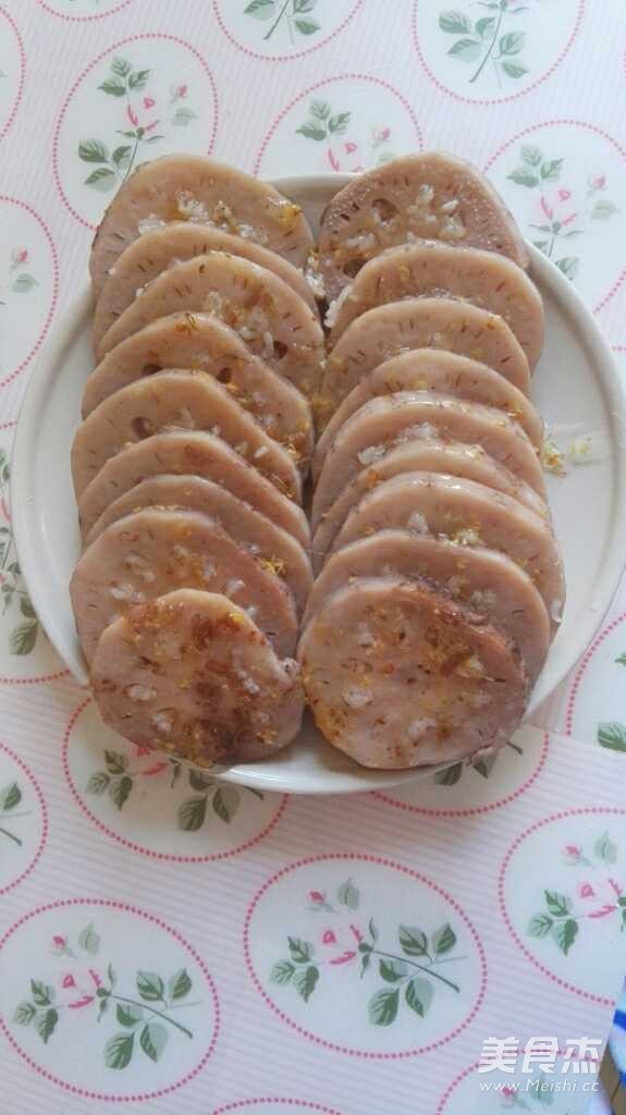 6.在锅里装上红糖冰糖,用水化开,把藕放进锅里,装盖过藕的水,然后煮2小时以上~最后捞出来切片装盘。然后淋上一点锅里剩的汁和桂花糖,喜欢也可以再淋点蜂蜜!待冷却后更好~