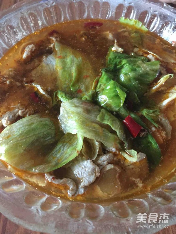 4.将腌好的牛肉一片一片放入开水中,煮熟。加入少许生抽提味,加入少许盐调味。肉熟后把肉和汤一起倒在铺满生菜的盆里。上面放上刚刚剩下的一半干辣椒,锅中烧热油,浇在干辣椒上,吃前拌匀即可。