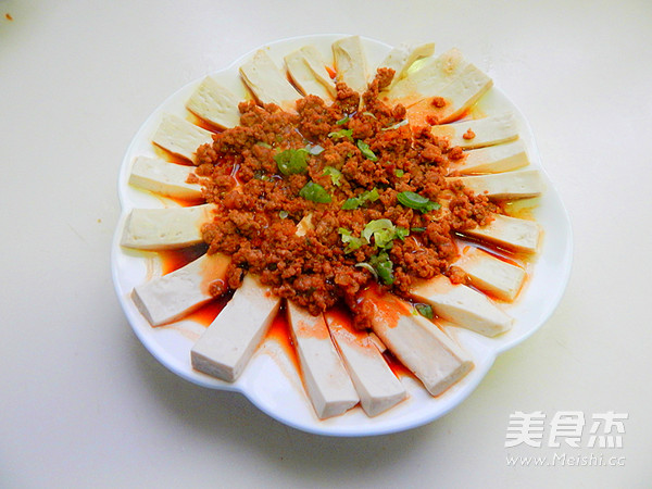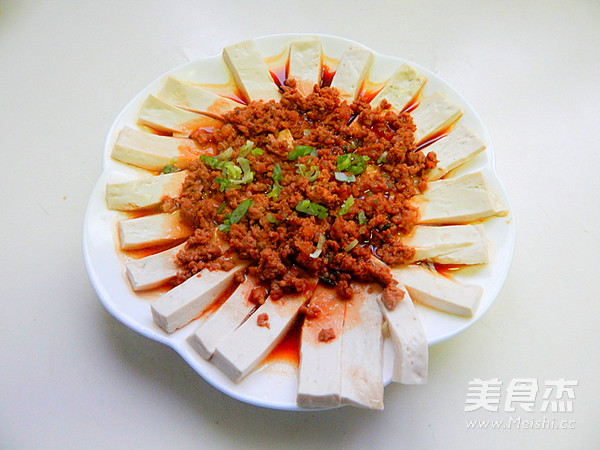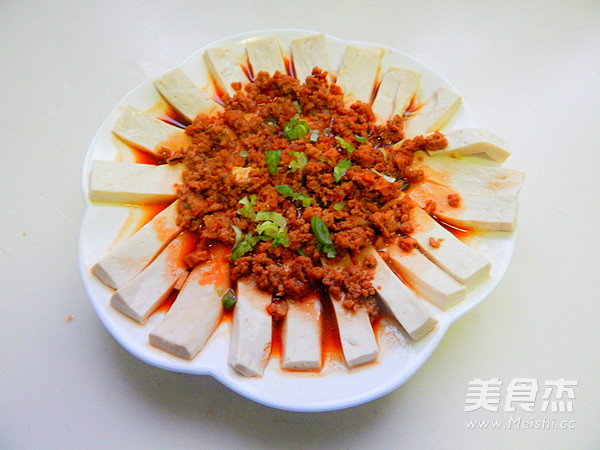 12.炒好的肉末盖在豆腐片上