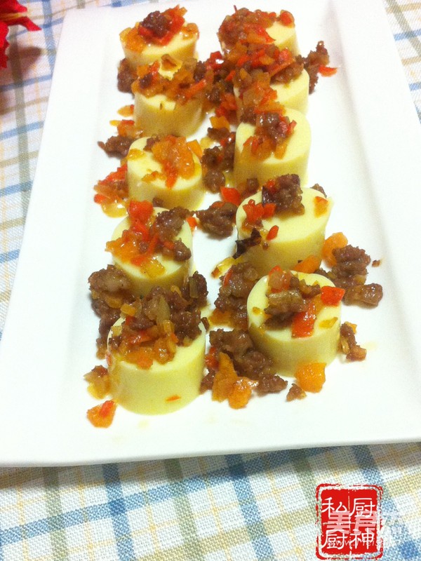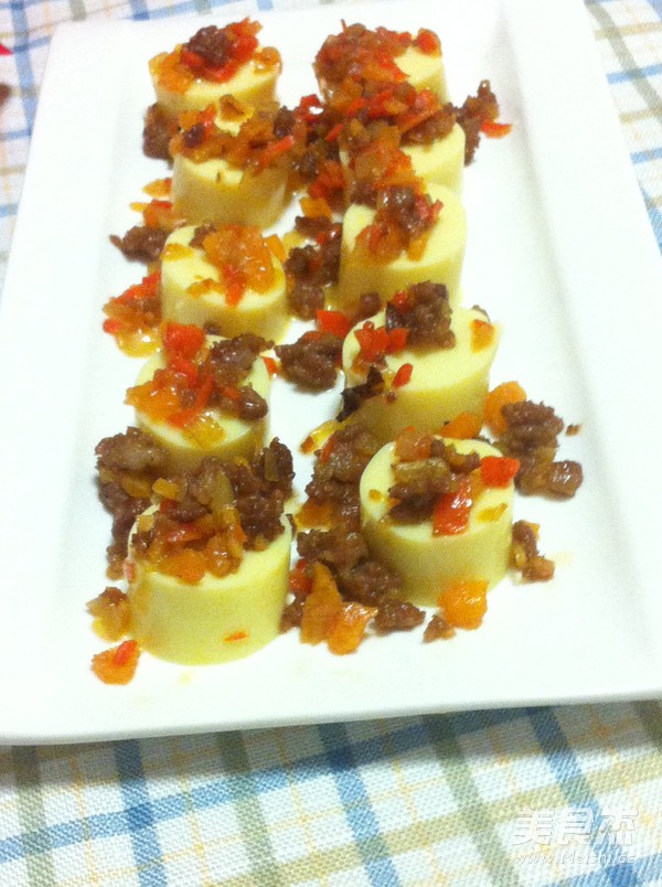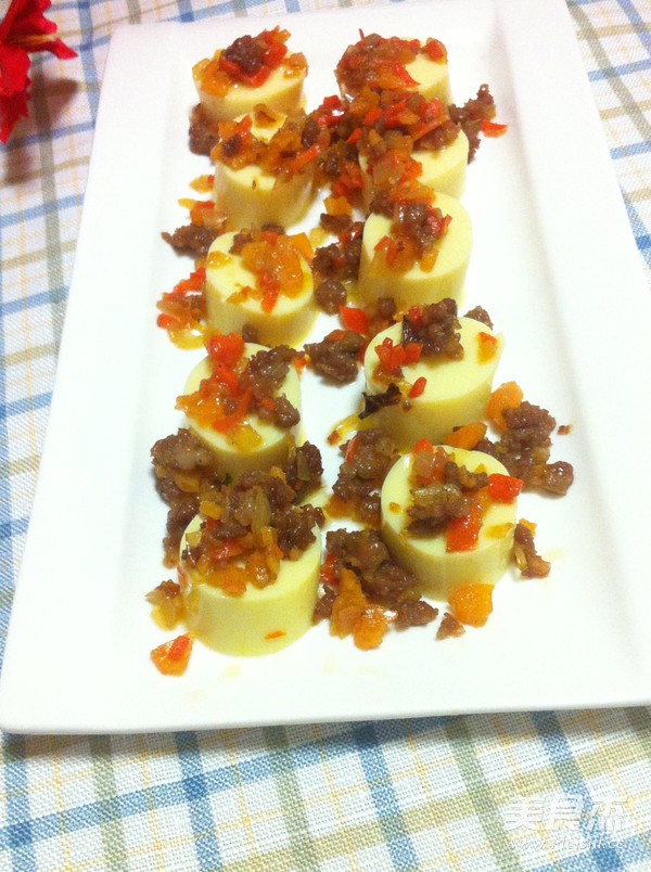 6.锅里放适量油下肉馅红萝卜末洋葱末煸炒烹入料酒蛋黄生抽蚝油煸炒,