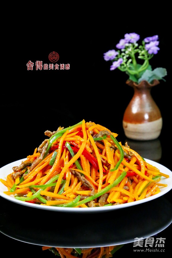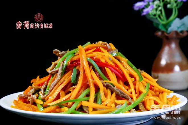 3.锅里去油,倒入牛肉丝,开大火,炒至7成熟时倒入金瓜丝大火翻炒,金瓜丝变色,加入适量鸡精,翻炒均匀即可起锅。