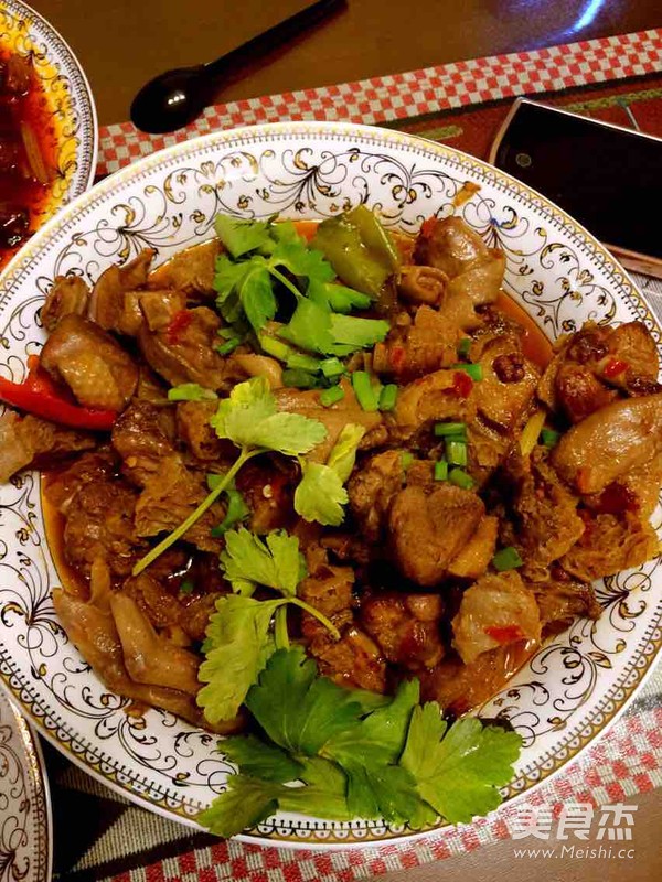 7.鸭肉入锅,大火煸炒,炒出很多水和油。不断翻炒直到鸭肉颜色变白变深