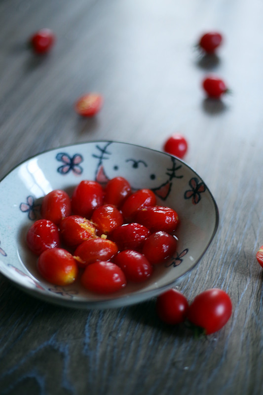 2.另用一盆烧水,水沸腾时下入圣女果,焯烫10余秒,立刻盛出放入冷水中,此时圣女果的皮会自动从切口处裂开,剥去圣女果的皮,备用