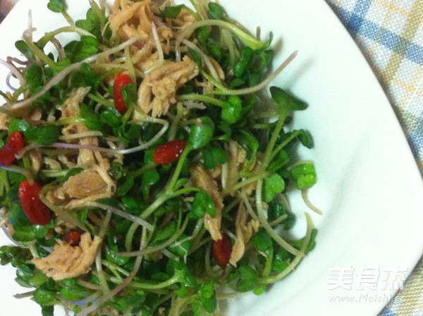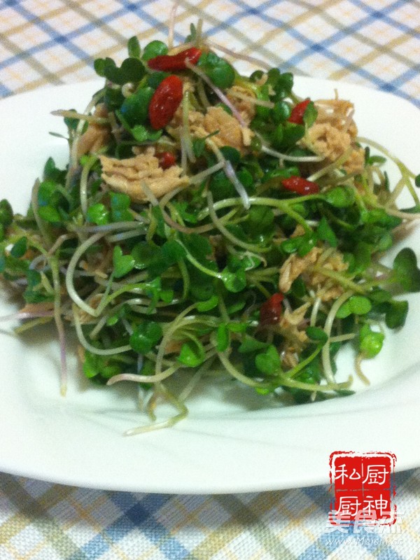 4.鸡丝加生抽香油盐糖拌匀加萝卜苗拌匀即可,