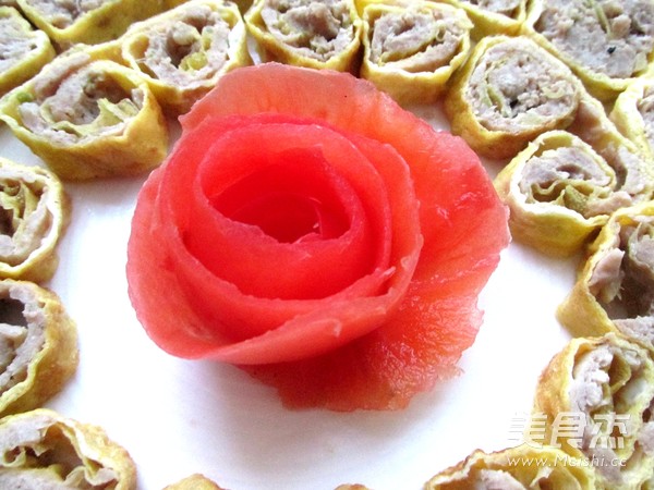 11.放凉切片摆入盘中,把西红柿皮削下做成花朵状即可