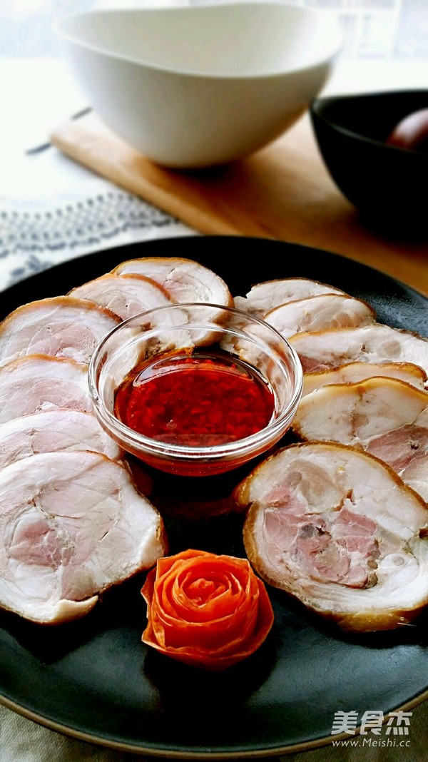 5.取出捆蹄拆去棉线,均匀切片。直接吃就是五香味的了,配个蘸汁更好了:蒜头加盐捣成泥,加入蚝油、香醋、麻油、红油搅拌均匀。