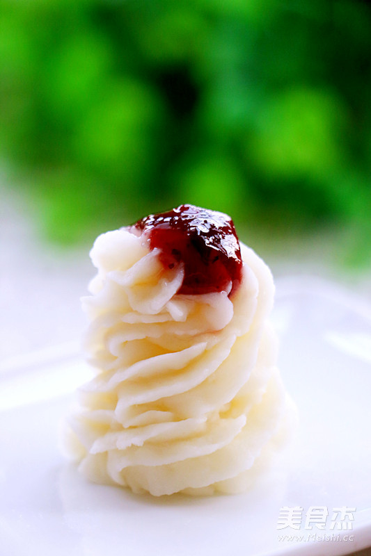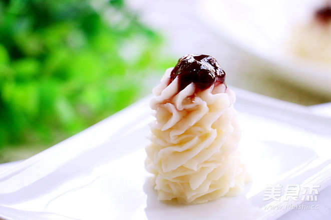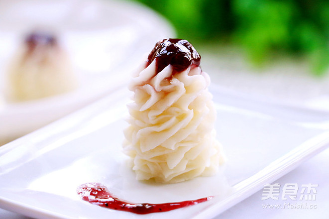7.挤出想要的花形,把蓝莓酱用纯净水稍稍稀释一下,淋在山药泥上就可以了
