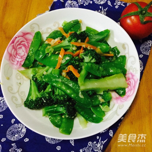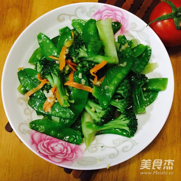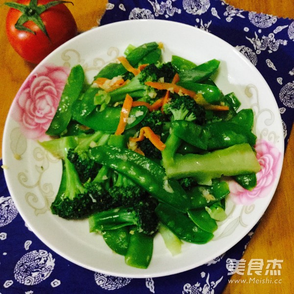 8.加入焯好的西兰花和荷兰豆炒至熟