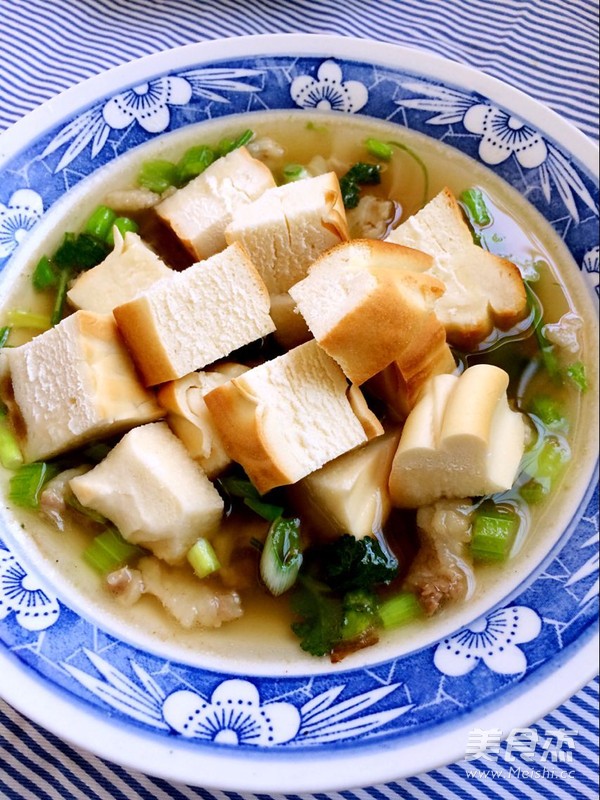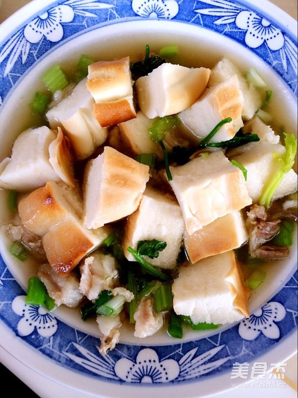 10.准备一个大点的碗,放入煮好的羊肉汤,上面放入切好的火烧块,根据自己口味在放点醋,胡椒粉,拌匀就可以吃了。