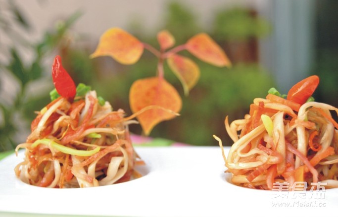 4.然后放入杏鲍菇丝炒约半分钟,加入胡萝卜丝和西兰花梗再炒约1分钟至胡萝卜微变软后,加入盐,鸡粉.淋上香油即可出锅.