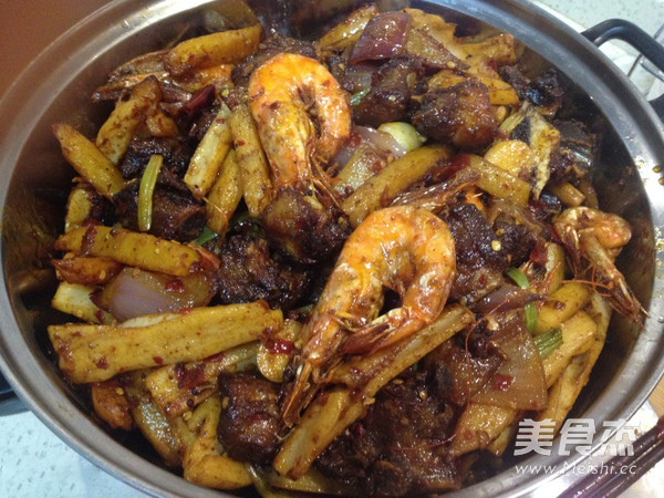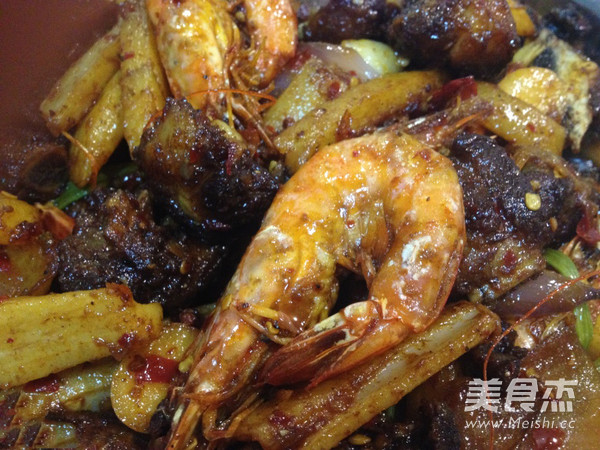 11.接着下虾继续翻炒,最后下土豆和藕条翻炒两分钟,加入少许鸡精就可以起锅了。