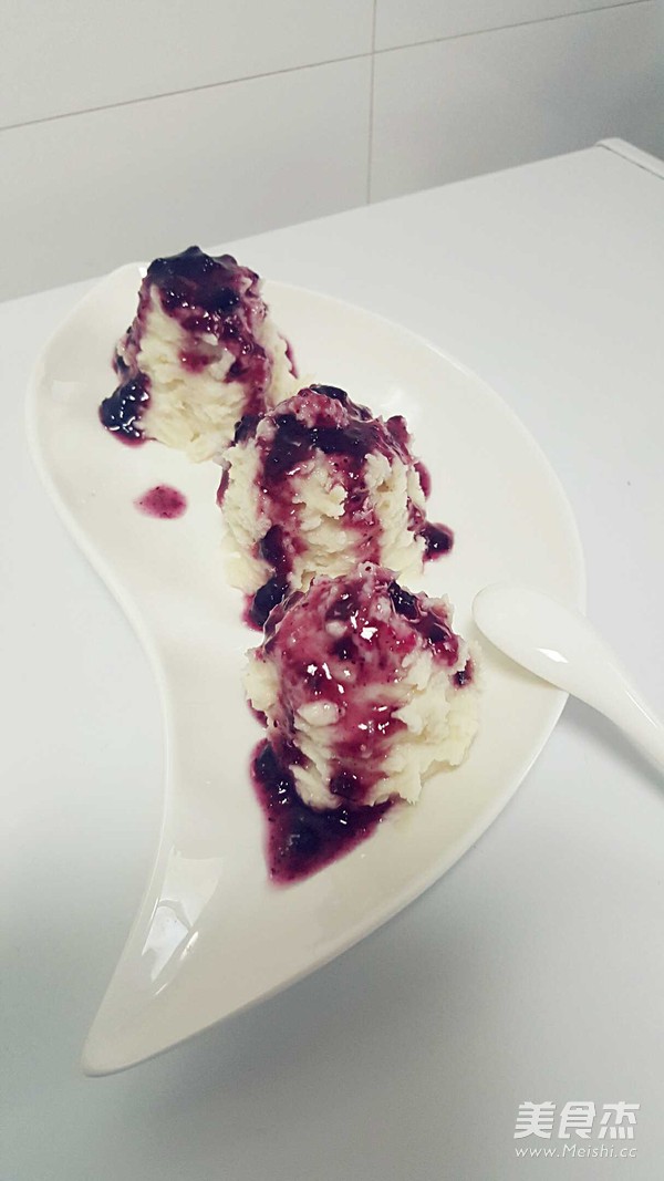 6.把蓝莓酱放一点点白开水化开浇上即可。摆盘大功告成。
