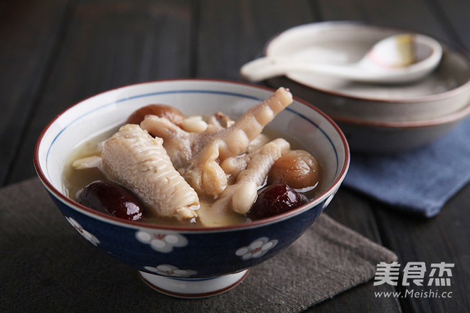 非常适合女性喝的一款靓汤。红枣可以补气养血安神;而花生中含有维生素E和一定量的锌,能增强记忆,抗老化,延缓脑功能衰退,滋润皮肤。在花生的诸多吃法中以炖吃为最佳,这样既避免了招牌营养素的破坏,又具有不温不火、口感潮润、入口好烂、易于消化的特点,老少皆宜。鸡爪大家都知道,富含钙质和胶原蛋白,同样有美容效果。红枣花生和鸡爪搭配煲汤,补血又养颜,常喝能让脸色红润、气色好。