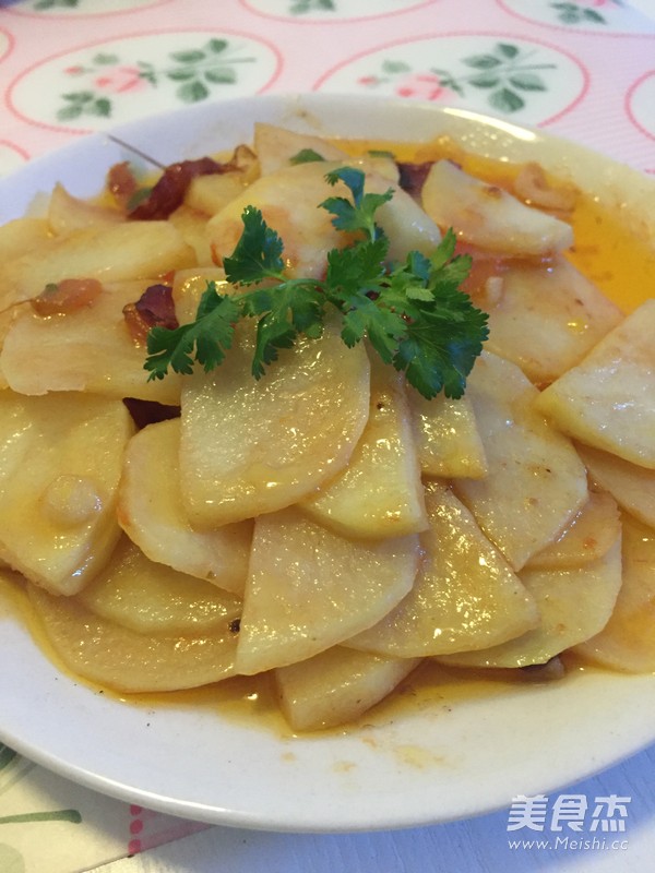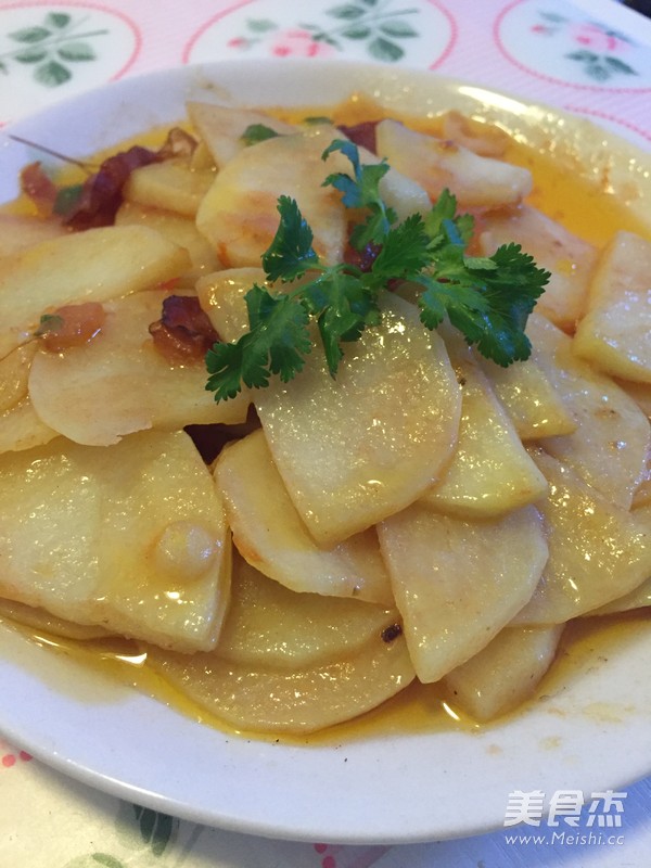 4.放入土豆片,加1调料匙鸡精、1汤匙料酒、1克或更少的白糖提味,大火翻炒,土豆片略透明或炒出淀粉感觉即为熟透,加入适量食盐、翻炒几下,乘出装盘。