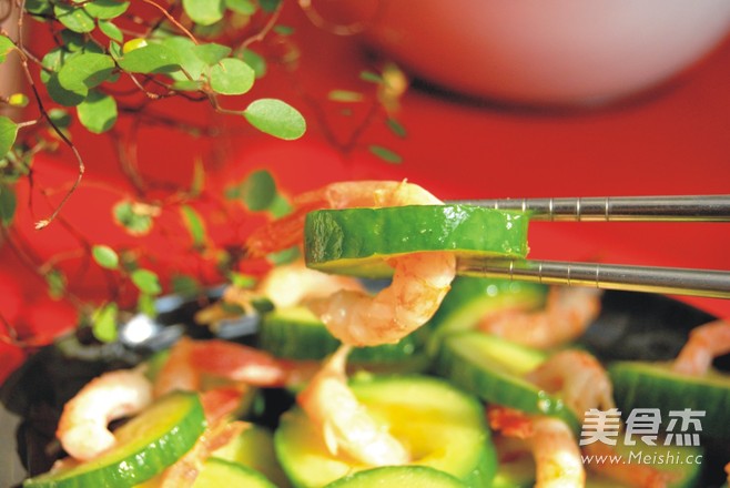 4.净锅倒入橄榄油,油热后倒入串好的黄瓜北极虾煸炒。