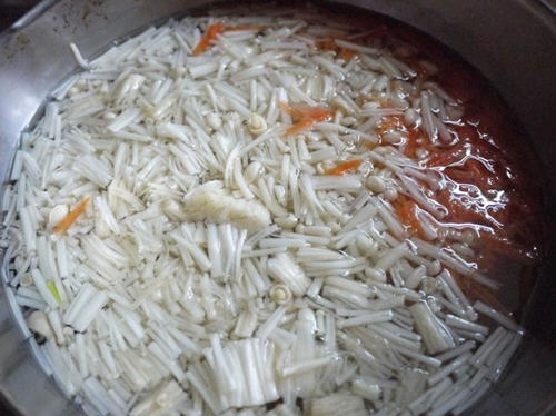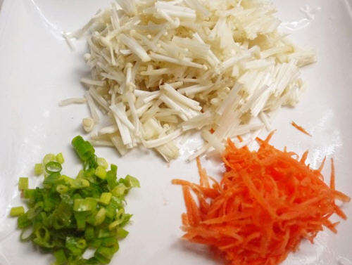 3、起一锅滚水将胡萝卜丝、金针菇稍煮软后沥干水份(不需煮太久,待会还要煎)。
