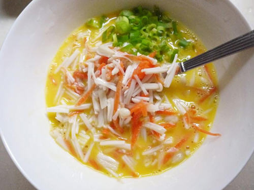 4、取一碗打蛋,再加入作法3葱花、盐拌匀。