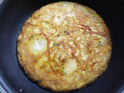 5、平底锅添油,锅热后将作法4倒入,盖上锅盖转中小火煎到蛋凝固。