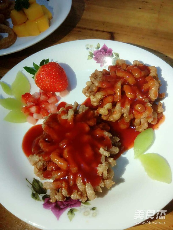 里脊肉炸至金黄色出锅后,番茄沙司陈醋加白糖炒出勾芡汁,淋上摆盘好的里脊肉即可!
