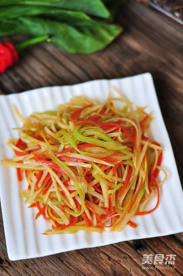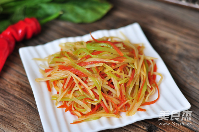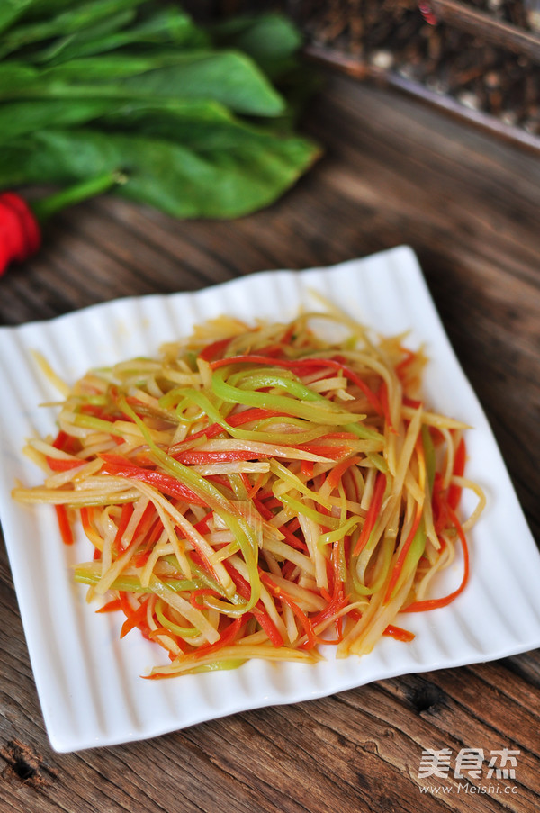 6.放入莴笋丝翻炒匀,调入适量盐炒匀后,调入适量醋,炒到土豆丝熟即可。