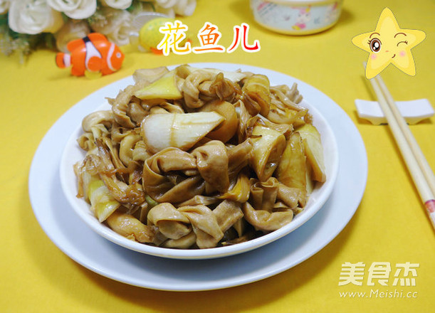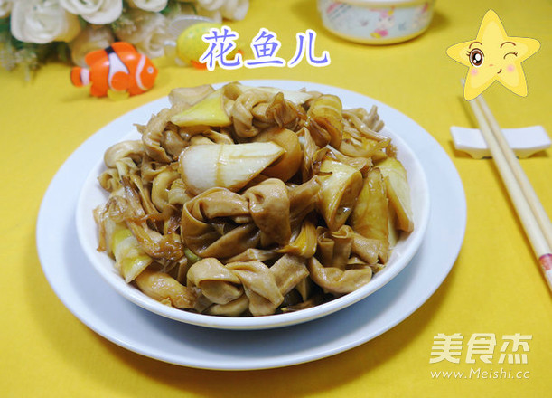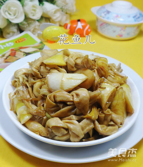 6.接着,合入已清洗好的黄花菜和千张结翻动一下