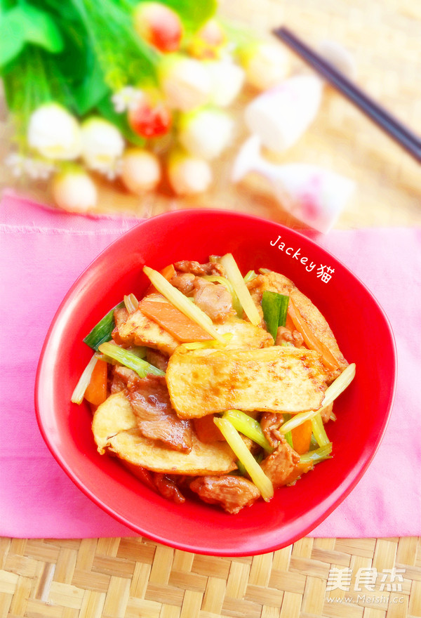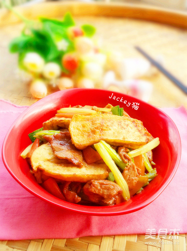 1.准备食材,瘦肉切片后加入适量的盐,糖,味极鲜,食用油,生粉腌制,香芹切段,油豆腐切大厚片,蒜苗,红萝卜切片备用