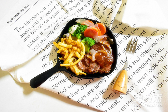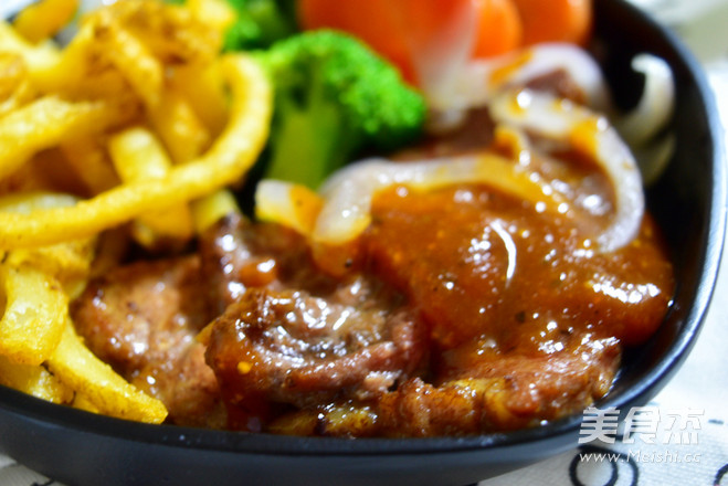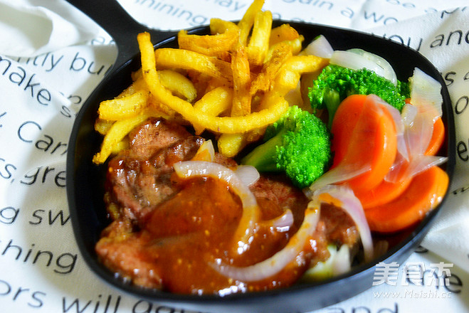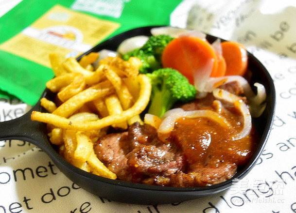 牛排150克 胡萝卜30克 洋葱50克 西兰花50克 薯圈20克