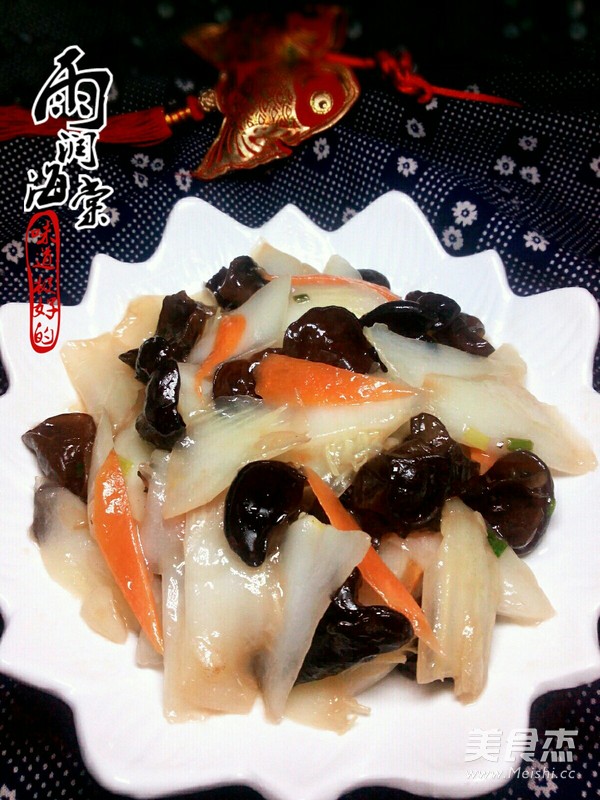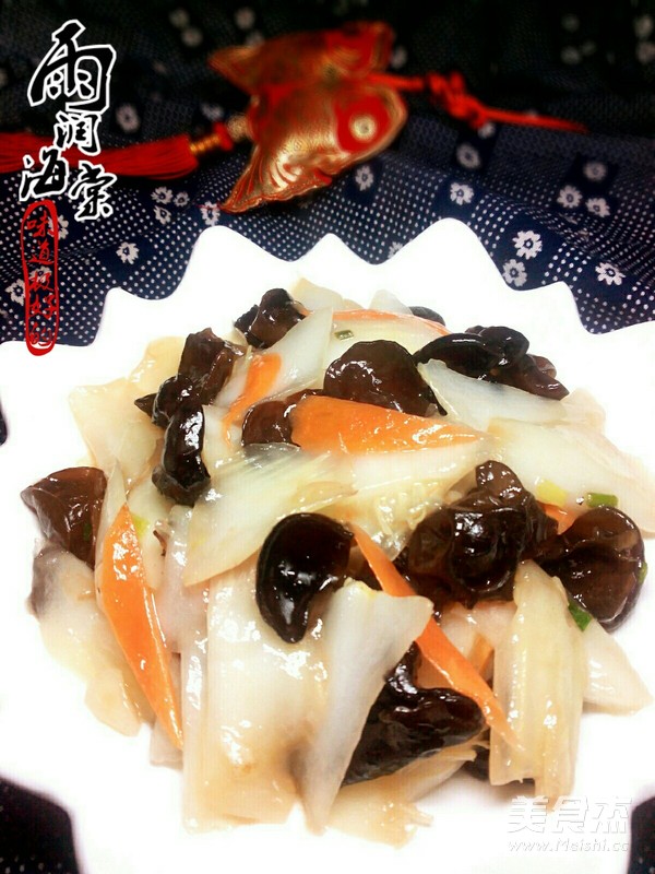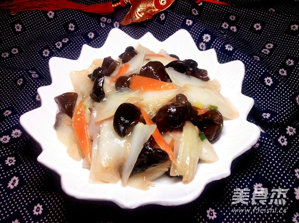 1.准备食材:白菜帮切片用水焯一下,木耳泡发后也用水焯一下,淀粉中放入盐和水搅匀