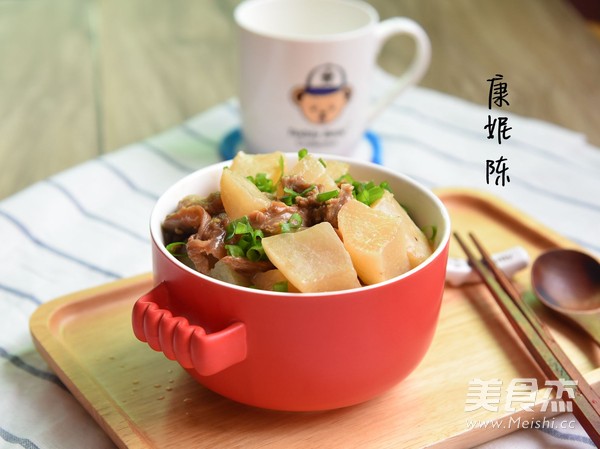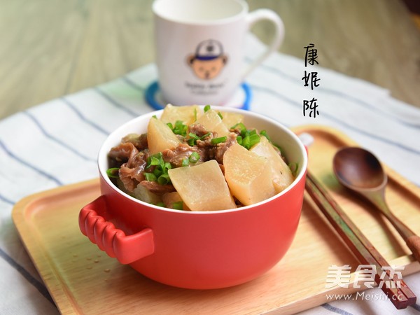 5.将黄酒加入到牛腩中,拌匀